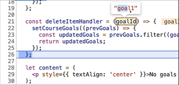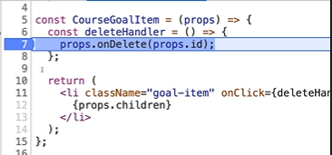deleteItemHandler 가 실행되는걸 볼 수있고 props 으로 "goal1" 이 들어온걸 알 수 있다.