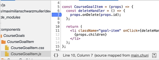 props의 id를 삭제하는 코드가 있는 line을 클릭 해주면 BreakPoint를 지정할 수 있다. (7번 라인)